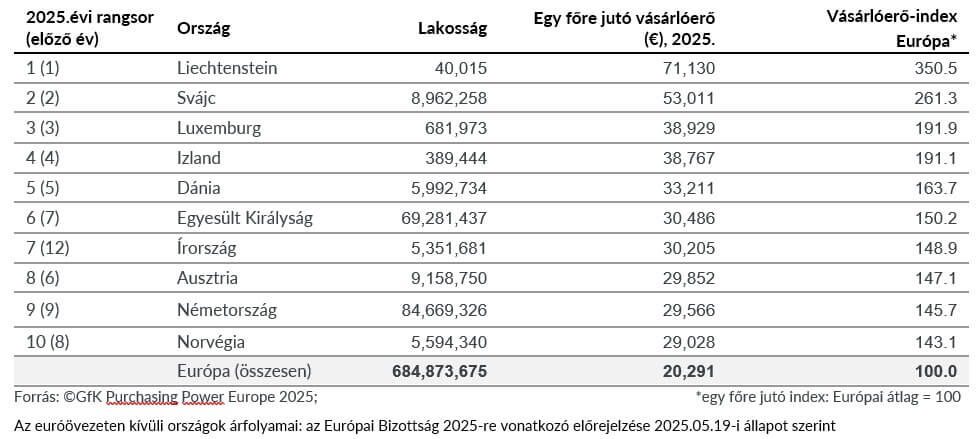 A korábbi évekhez hasonlóan Liechtenstein 2025-ben is jelentős előnnyel az első helyen áll a vásárlóerő-rangsorban. A liechtensteini lakosok egy főre jutó vásárlóereje 71.130 euró, ami 3,5-szerese az európai átlagnak. A második és harmadik helyen Svájc és Luxemburg következik. A svájciak egy főre jutó vásárlóereje 53.011 euró, ami 2,6-szorosa az európai átlagnak, míg a luxemburgiak nettó rendelkezésre álló jövedelme 38.929 euró fejenként. Ez több mint 1,9-szerese az európai átlagnak.