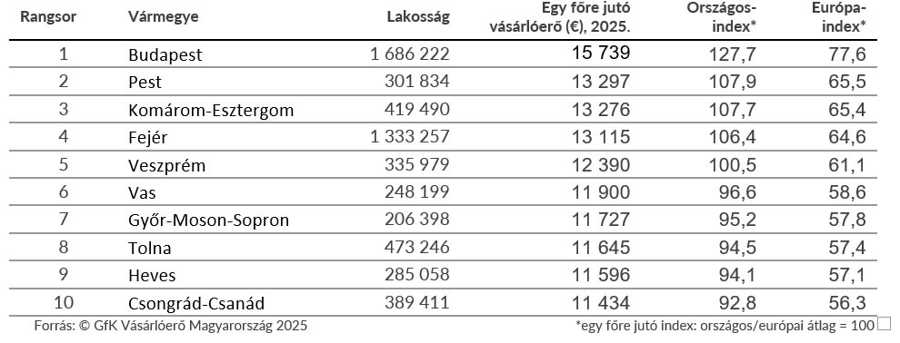 A 20 magyarországi vármegyét vizsgálva kiderül, hogy különösen az öt átlagon felüli vásárlóerővel rendelkező vármegye tudta megvédeni első helyét (Budapestet is ideértve). Ezek mindegyike a főváros környékén, vagy attól nyugatabbra található. Az egy főre jutó 15.739 eurós költési potenciállal a főváros közel 28 százalékkal az országos átlag felett egyértelműen az első helyen áll.