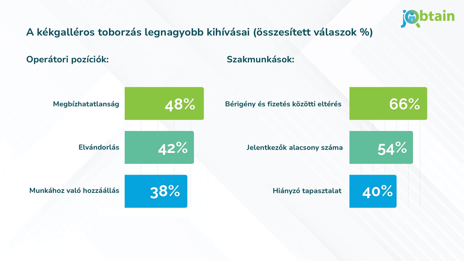 „Az eredmények is jól mutatják, hogy az operátori munkakörökben kiemelkedően magas a fluktuáció, ami nemcsak HR, hanem komoly üzleti probléma. A cégek újra és újra kénytelenek betanítani a dolgozókat, miközben a megbízhatóság továbbra is nehezen mérhető és előrejelezhető” – hangsúlyozza a szakértő. A szakmunkásoknál a bérigény és a kínált fizetés közötti eltérés (66%), a jelentkezők alacsony száma (54%) és a hiányzó tapasztalat (40%) okozza a legnagyobb nehézséget.