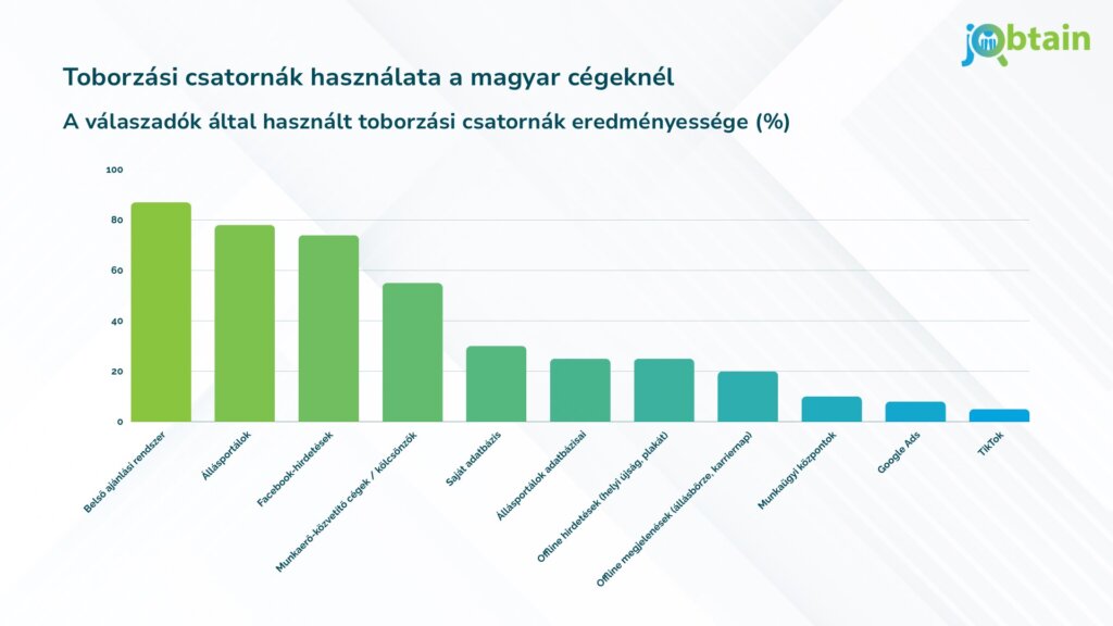 „A kutatás egyik legmeglepőbb eredménye, hogy a cégek 36%-a egyáltalán nem méri a toborzás eredményességét. A jelöltadatbázis újrahasznosítása sem általános gyakorlat: csak 27% használja rendszeresen a korábbi jelentkezők adatait az újabb keresések során. A jelenlegi munkaerőpiaci környezetben pedig különösen fontos, hogy a toborzás ne csak gyors, hanem tudatos és mérhető legyen” – emeli ki Mihályi Magdolna, a Jobtain HR szolgáltató ügyvezetője.