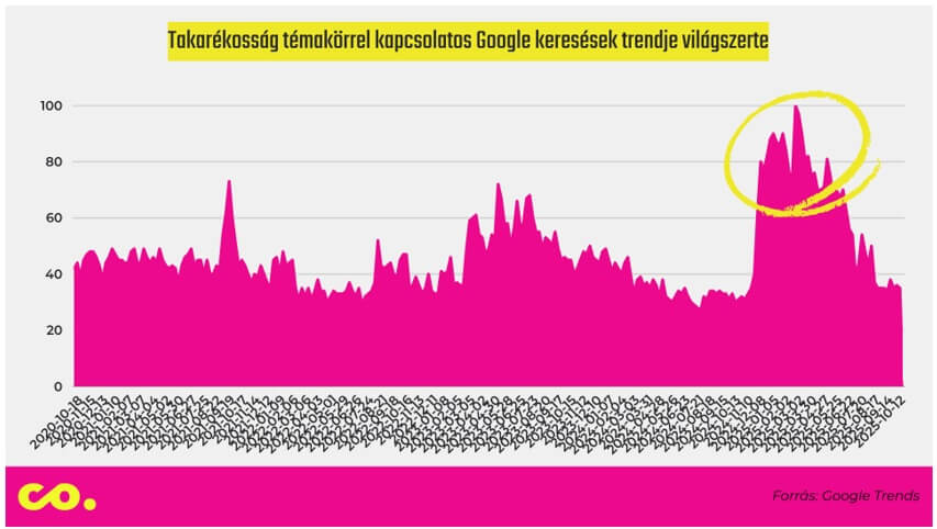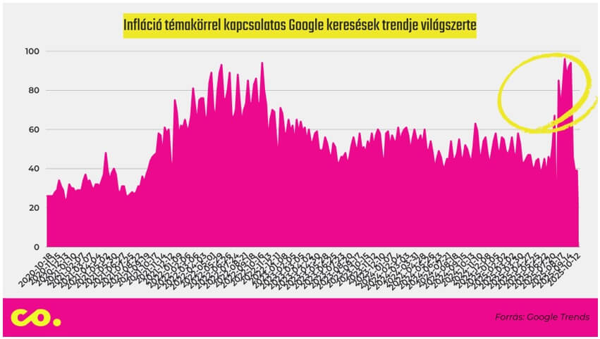 A válsággal kapcsolatos említések száma (55 921) önmagában még nem mondható kiugrónak, azonban a Google Trends adataival való összevetés sokat elárul: az inflációval kapcsolatos keresések száma jelentősen megugrott az elmúlt egy évben.