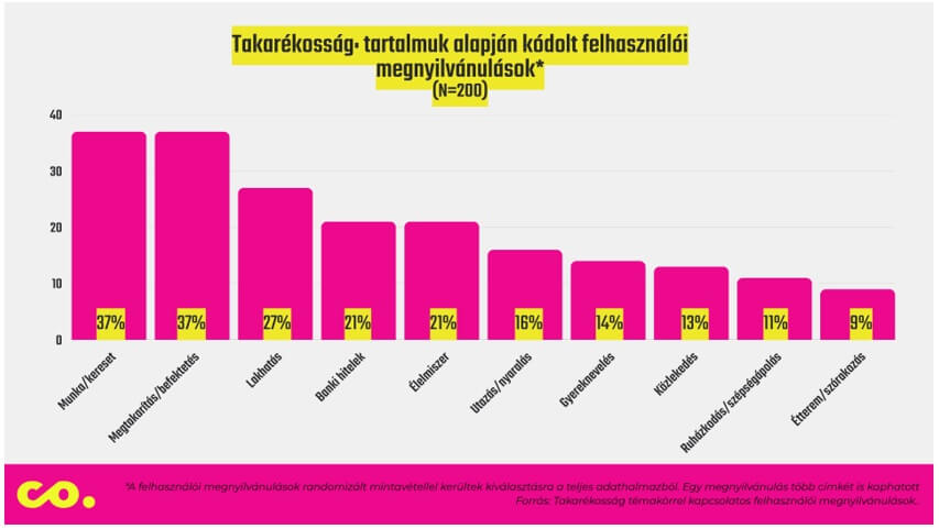 A takarékossággal kapcsolatban a munka és kereset, illetve a megtakarítás, befektetés kérdések foglalkoztatták leginkább a netezőket. A fogyasztás visszafogásával kapcsolatos gyakorlati tanácsok három fő téma köré épülnek: lakhatás, banki hitelek, élelmiszer.