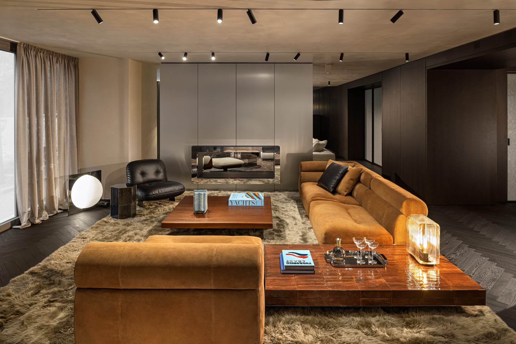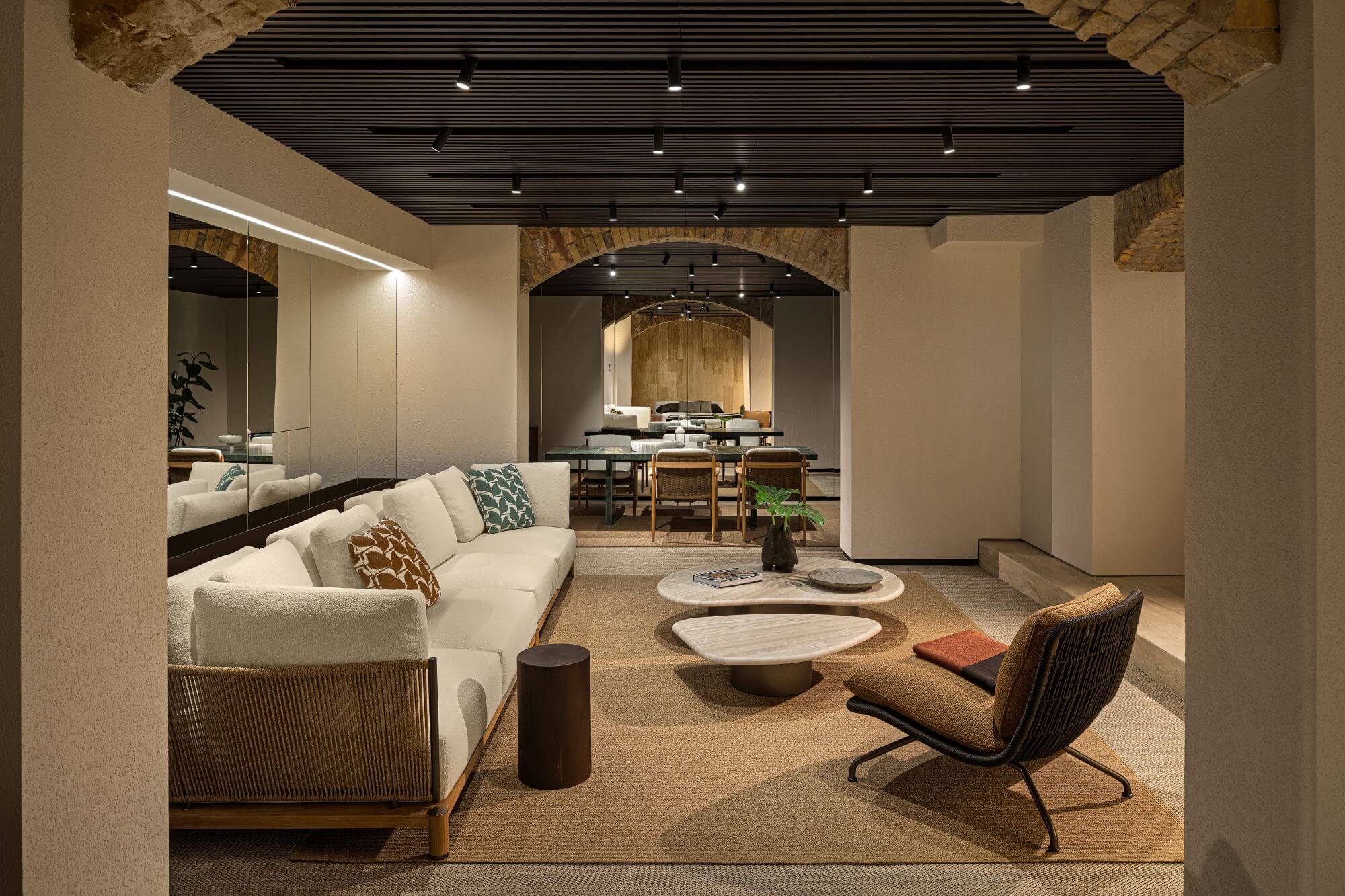A bemutatóterem koncepciójának alapja a minőségi anyaghasználat és a modern, mégis kiegyensúlyozott színvilág. Wenge pácolású tölgyfából készült halszálka parketta és falburkolatok, valamint travertin mészkő részletek váltakoznak lakkozott és tükrös felületekkel. A helyiségben a márka ikonikus bútorai és a 2025-ös kollekció friss darabjai is megjelennek. Köztük megtalálható a Coupé kanapé, Giampiero Tagliaferri Laurel és Libra fotelei, valamint Hannes Peer Riley kanapéja is. Az alsó szinten két kültéri rész és egy hálószoba-enteriőr várja a látogatókat.
