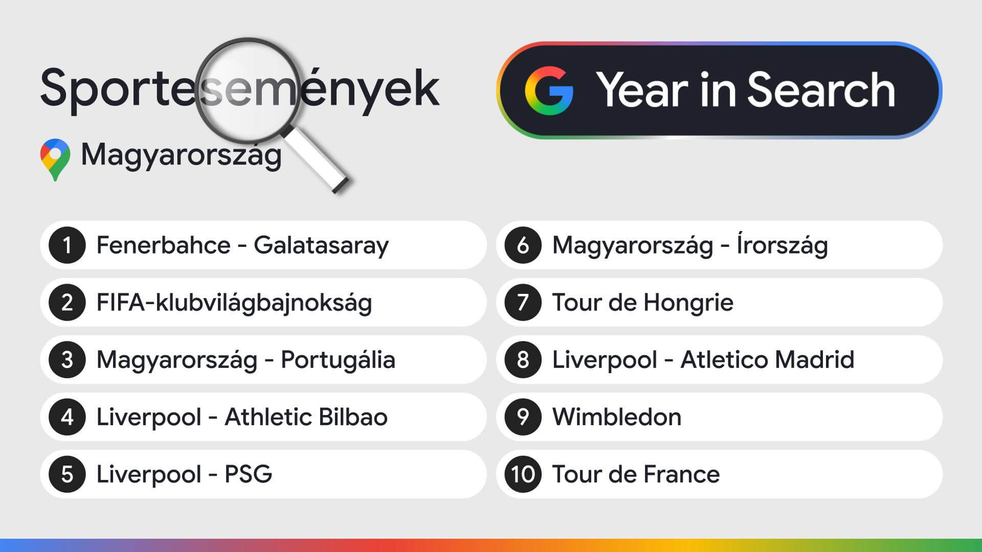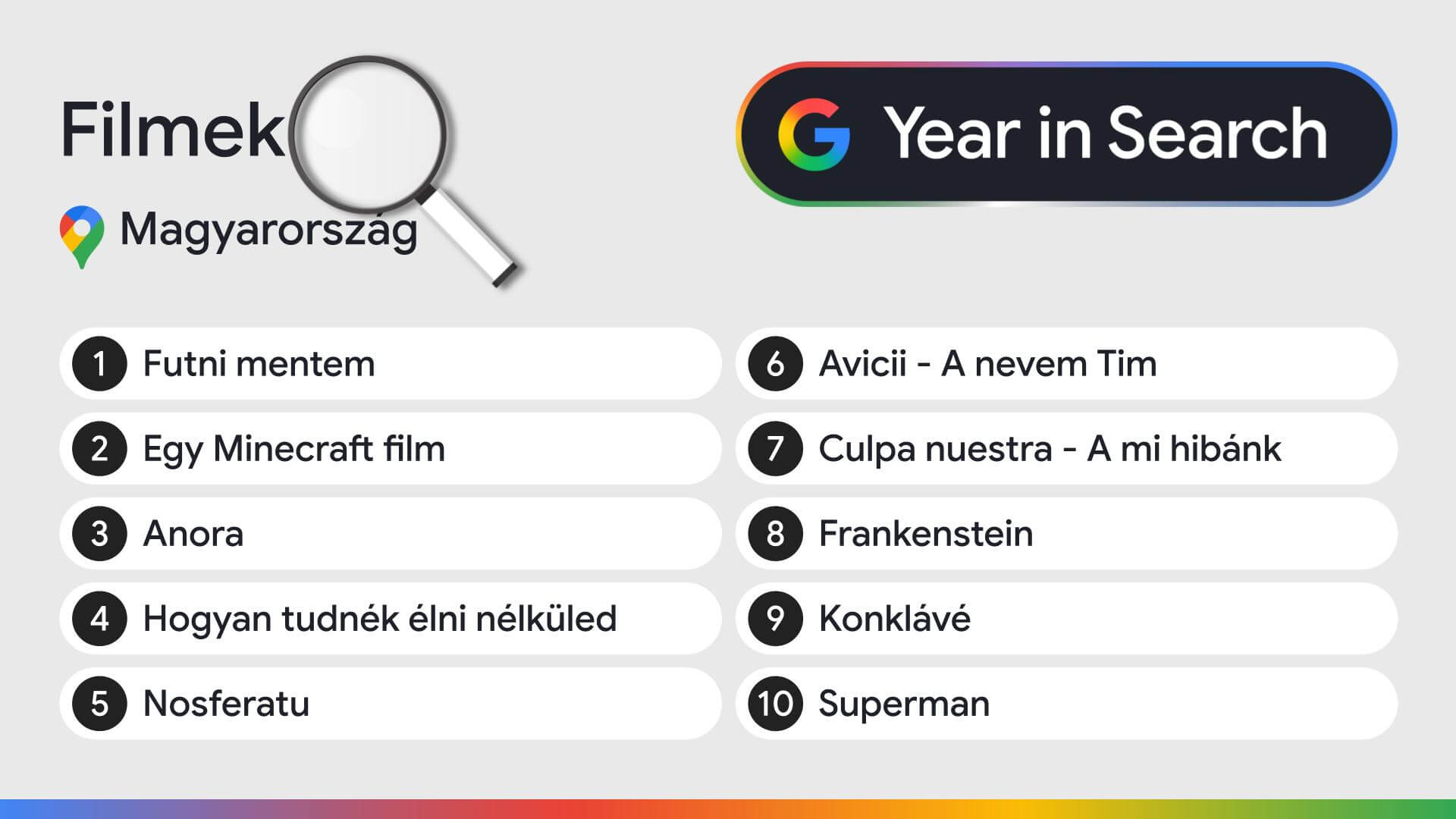 Idén is rendkívül változatos témák iránt érdeklődtek a magyar internetezők a Google Kereső trendjei alapján. A filmek mezőnyét 2025-ben a hazai kasszasikerek – például a Futni mentem, illetve a Hogyan tudnék élni nélküled – és a klasszikus történetek újragondolásai vezették, hisz felkerült a listára a Nosferatu, a Frankenstein és a Superman is. A sorozatok között a nagyszabású történelmi produkció, a Hunyadi bizonyult a legnépszerűbbnek, miközben továbbra is az érdeklődés középpontjában áll a Squid Game – Nyerd meg az életed, valamint Az aranyifjú. A tévéműsorok listáját idén a Pokoli rokonok vezette, de a Házasság első látásra, az Exek csatája és tehetségkutatók is hatalmas nézői bázist mozgattak meg. A zenei keresések élén idén is a fesztiválok és a hazánkba érkező világsztárok álltak: a Sziget, az EFOTT, valamint az Imagine Dragons fellépése keltették fel leginkább az érdeklődést, míg Pitbull jövő évi koncertje már 2025-ben rengeteg keresést generált. 2025-ben több ismert személyiség elvesztése mozgatta meg a közvéleményt: a legtöbben Kálloy Molnár Péter, Kathi Béla, illetve Ferenc pápa nevére kerestek rá. A sportesemények közül a nemzetközi labdarúgó-mérkőzések, a FIFA-klubvilágbajnokság, valamint a Tour de Hongrie, a Tour de France és Wimbledon vonzotta a legnagyobb érdeklődést. A gasztronómiai keresésekben az ünnepekhez kötődő receptek, a klasszikus finomságok és a trendi alapanyagok egyaránt előtérbe kerültek: a húsvéti kalács és a pavlova mellett a dubai csoki is az év legfelkapottabb keresései közé tartozott. A „Miért…”, „Mi…” és „Hogyan…” típusú kérdések listái pedig idén is jól mutatják a magyarok határtalan kíváncsiságát: a hétköznapi jelenségektől a közéleti kérdéseken át egészen az életvezetési dilemmákig rendkívül sok minden foglalkoztatta a hazai felhasználókat 2025-ben.