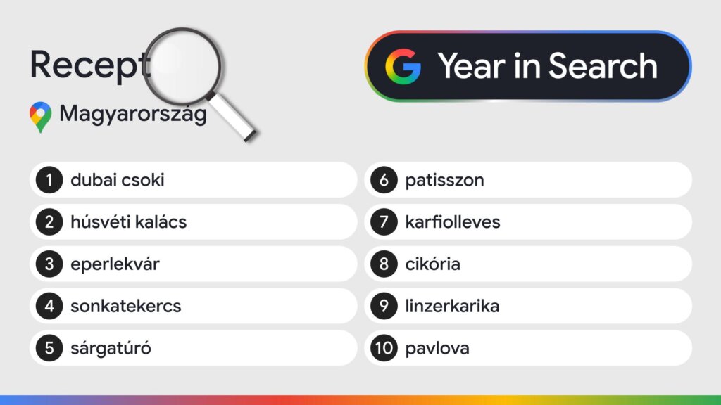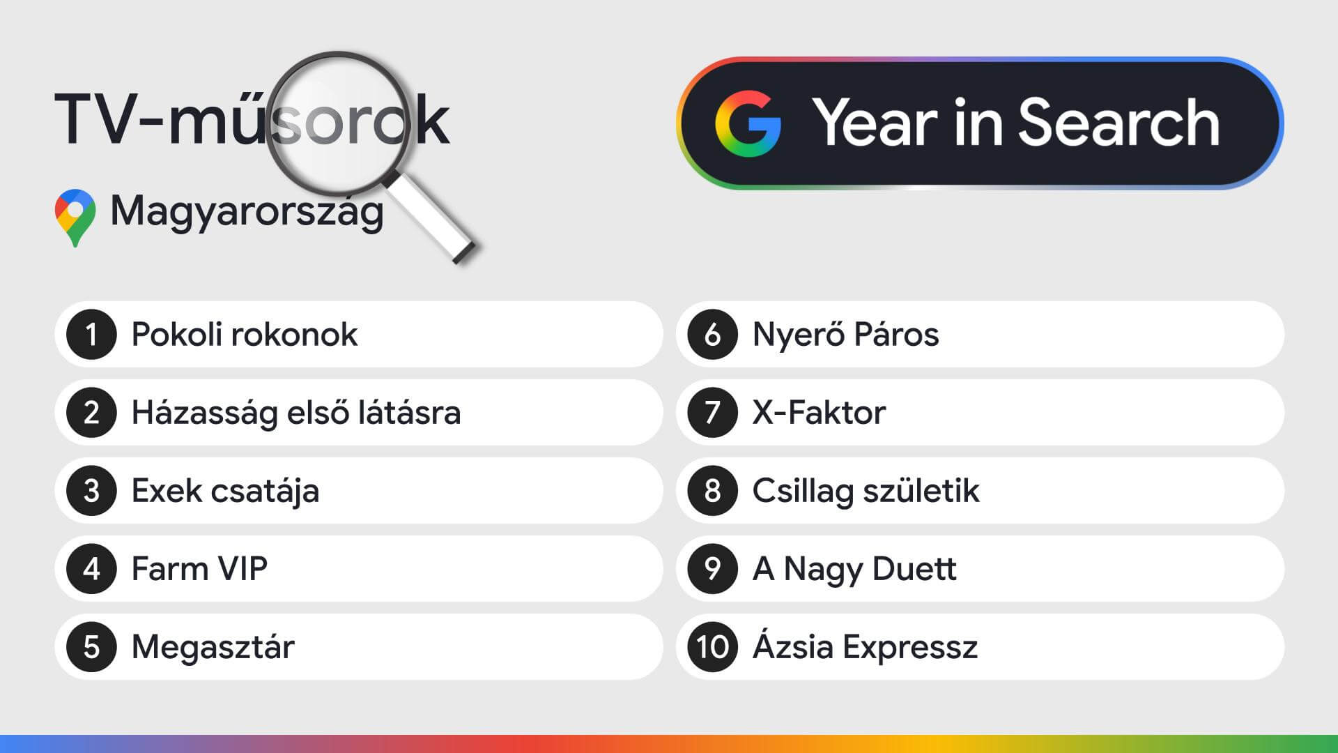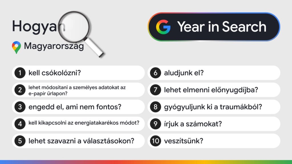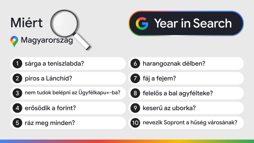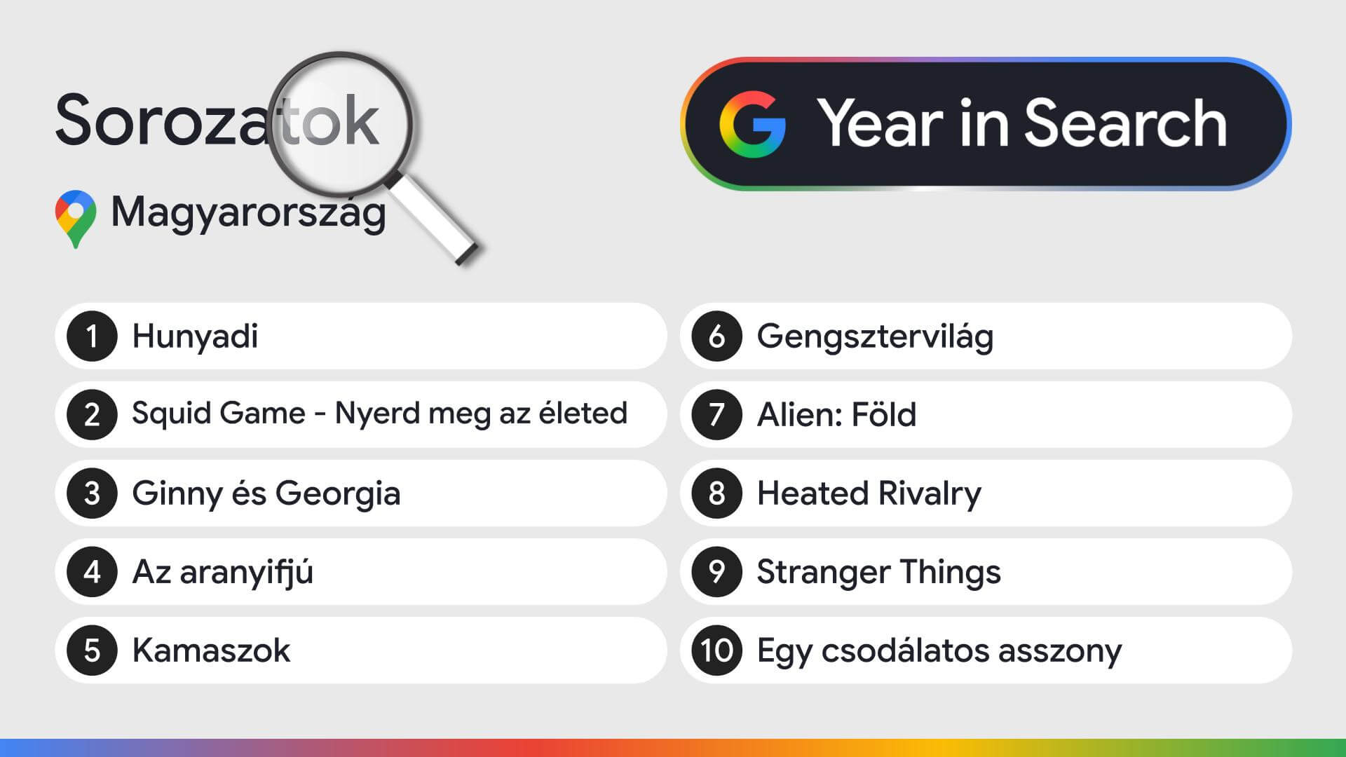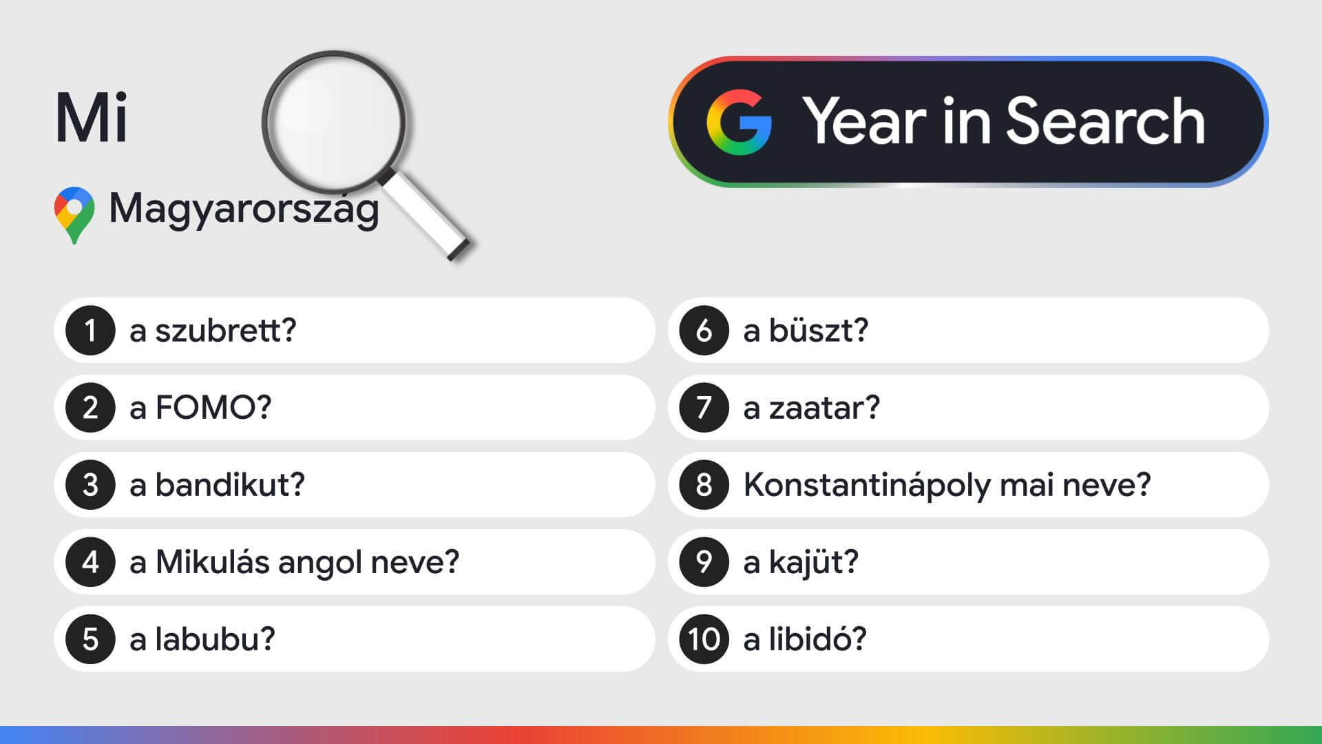 A Google Kereső idei trendjei pontos képet adnak arról, mi érdekli leginkább a magyarokat: a könnyed szórakozástól az igazán komoly témákig minden megjelent – feltárva, min nevettünk, min gondolkodtunk el, és mi tartotta lázban a közönséget az év során. A listák a Year in Search oldalán érhetők el.