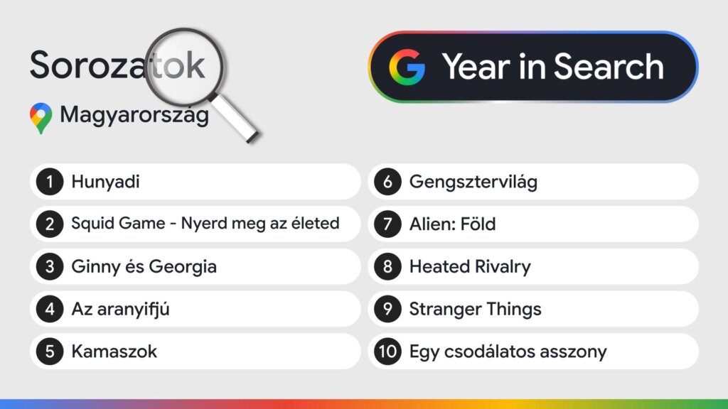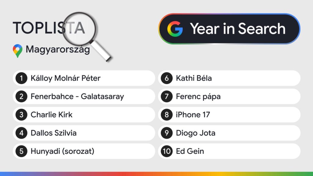 A Google hagyományosan az év végén teszi közzé „Year in Search” összeállítását, amely átfogó képet ad arról, milyen témák foglalkoztatták leginkább a felhasználókat, mik voltak az év legfelkapottabb keresései. A 2025-ös lista ismét pontos lenyomata az év közéleti, kulturális és szórakoztató eseményeinek – izgalmas képet adva például a hazai érdeklődési körökről, néha látványos és meglepő trendeket feltárva.