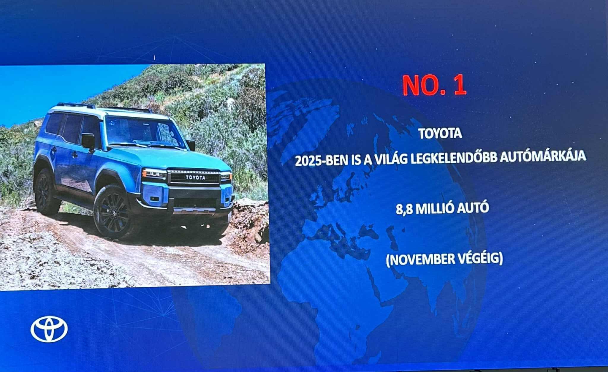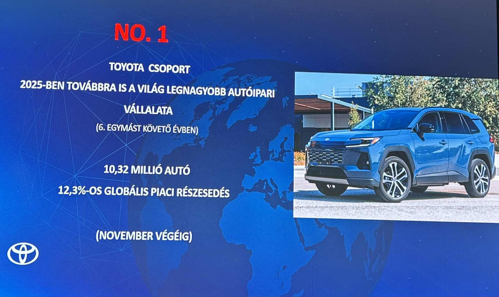 A Toyota 2025-es globális értékesítéseiben a korábbinál is markánsabb részt képviseltek a részben vagy teljesen elektromos (öntöltő hibrid elektromos, plug-in hibrid elektromos, akkumulátoros elektromos és hidrogén üzemanyagcellás elektromos) autók: a november végéig világszerte értékesített 9,6 millió Toyota és Lexus modell 47,5%-a volt elektrifikált, Európában pedig ennél is nagyobb, 77%-os elektrifikált arányt ért el a vállalat két vezető márkája. A Toyota Csoport egyébiránt november végéig világszinten nem kevesebb mint 10,3 millió új autót (8,8 millió Toyota, 0,8 millió Lexus, 0,6 millió Daihatsu és 0,1 millió Hino) új autót értékesített, a teljes éves adatok a napokban lesznek elérhetőek de várhatóan az összeladás megközelíti vagy akár meg is haladja a 11 milliót, ezzel