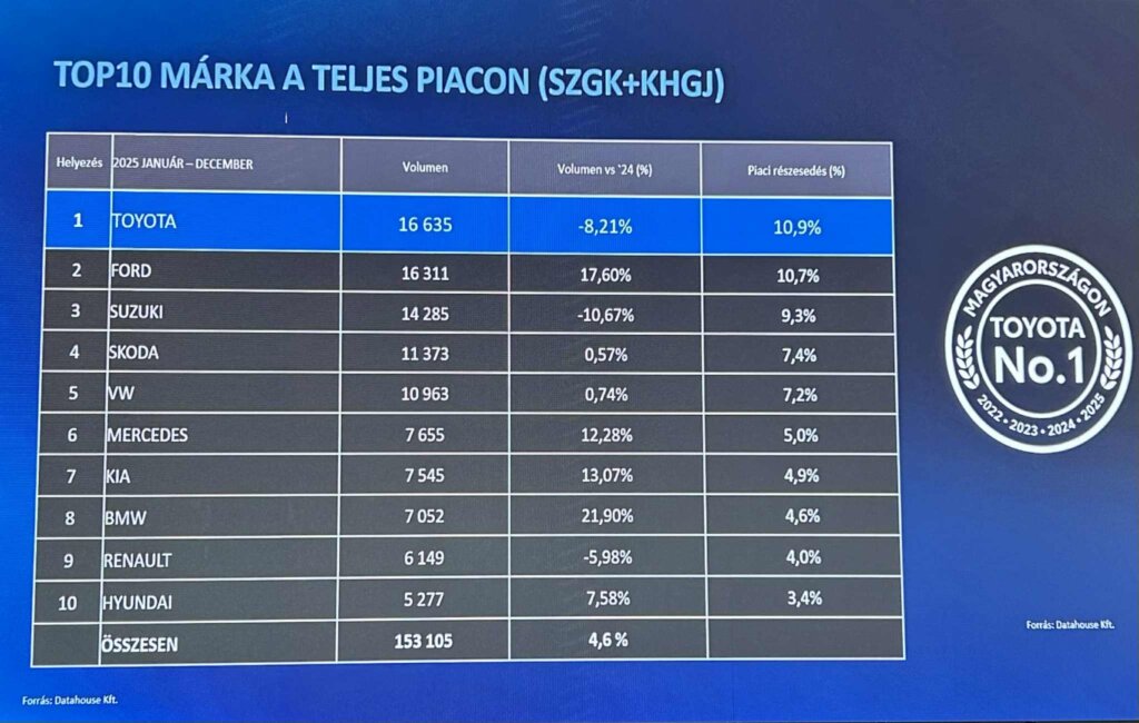 A Toyota tavaly Magyarországon 16.635 új autó értékesítésével, 10,9%-os piaci részesedéssel a negyedik (a kivonásokkal tisztított adatokat alapul véve pedig a hatodik) egymást követő évben végzett az első helyen a magyarországi ú személyautó és kishaszongépjármű piacon. Ugyancsak remek zárt a Lexus is hazánkban: a japán luxusautómárka 1.354 új autó értékesítésével, 6,3%-os prémium piaci részesedéssel zárta 0 2025-ös évet hazánkban.