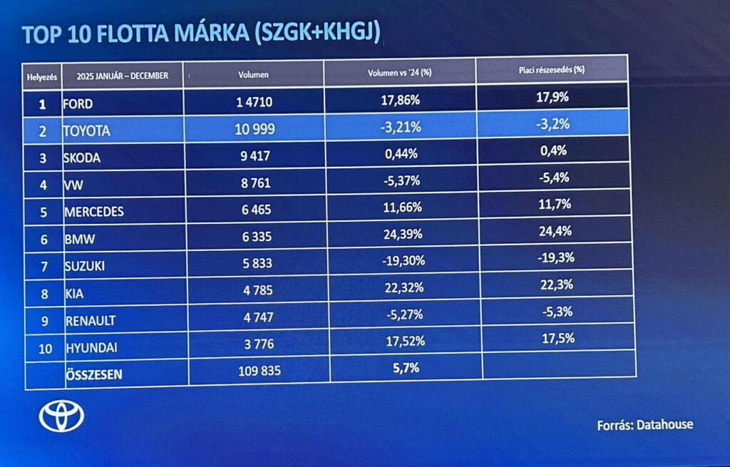 A kivonásokkal tisztított flottapiacon immár hagyományosan vezető pozíciót betöltő és 9.930 új autó eladásával, 12,4%-os flottapiaci részesedéssel 2025-ben sorozatban az ötödik alkalommal az élen záró Toyota számára az egyik kiemelt területet a kishaszongépjármű piac jelentette tavaly. Az immáron valamennyi kishaszongépjármű szegmenst akár elektrifikált kínálattal is lefedő környezettudatos autómárka 2.773 új haszongépjármű értékesítésével, 11,7%-os részesedéssel bizonyult a második legkedveltebb választásnak a haszongépjármű vásárlók körében. A siker egyik fontos tényezője volt, hogy a Toyota 175%-al növelte akkumulátoros elektromos haszongépjármű eladásait, 16,1%-os részesedést kihasítva a BEV haszongépjárművek piacából. A legnagyobb arányban a PROACE MAX-ot keresték tisztán elektromos kivitelben az ügyfelek, itt ez a meghajtás tette ki az értékesített autók negyedét, de a Proace City és Proace modellek Van kifitelei estében is minden hatodik ügyfél az akkumulátoros elektromos meghajtás mellett döntött.