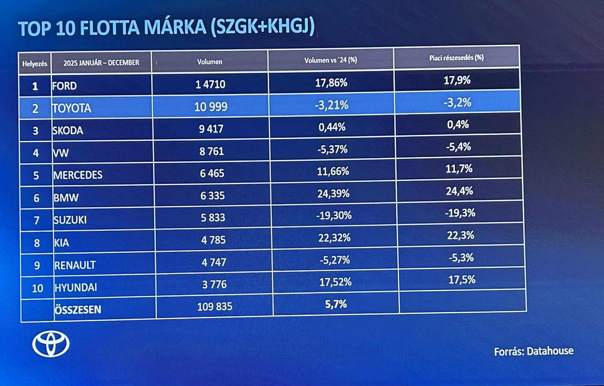 A Toyota Csoport világszinten a hatodik, míg a Toyota márka magyarországi személyautó- és kishaszongépjármű piacon a negyedik (a hazai utakon maradó autókról reális képet mutató kivonásokkal tisztított újautó piacon pedig ugyancsak a hatodik) egymást követő évben végzett az élen 2025-ben.