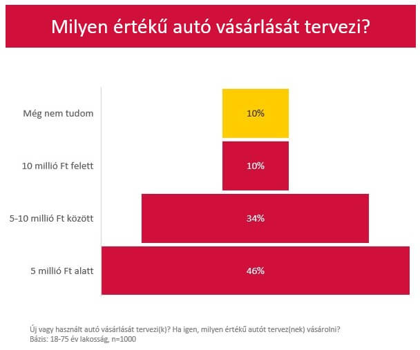 felük 5 éves vagy fiatalabb típust szerezne be. Egyötödük nyitott arra, hogy elektromos autóra váltson. Az autóvásárlást tervezők közel fele (46%) 5 millió forintnál olcsóbb kocsit venne, minden harmadik (34%) 5-10 milliós autót nézne ki magának, tizedük pedig a 10 millió forint feletti példányokból válogatna.